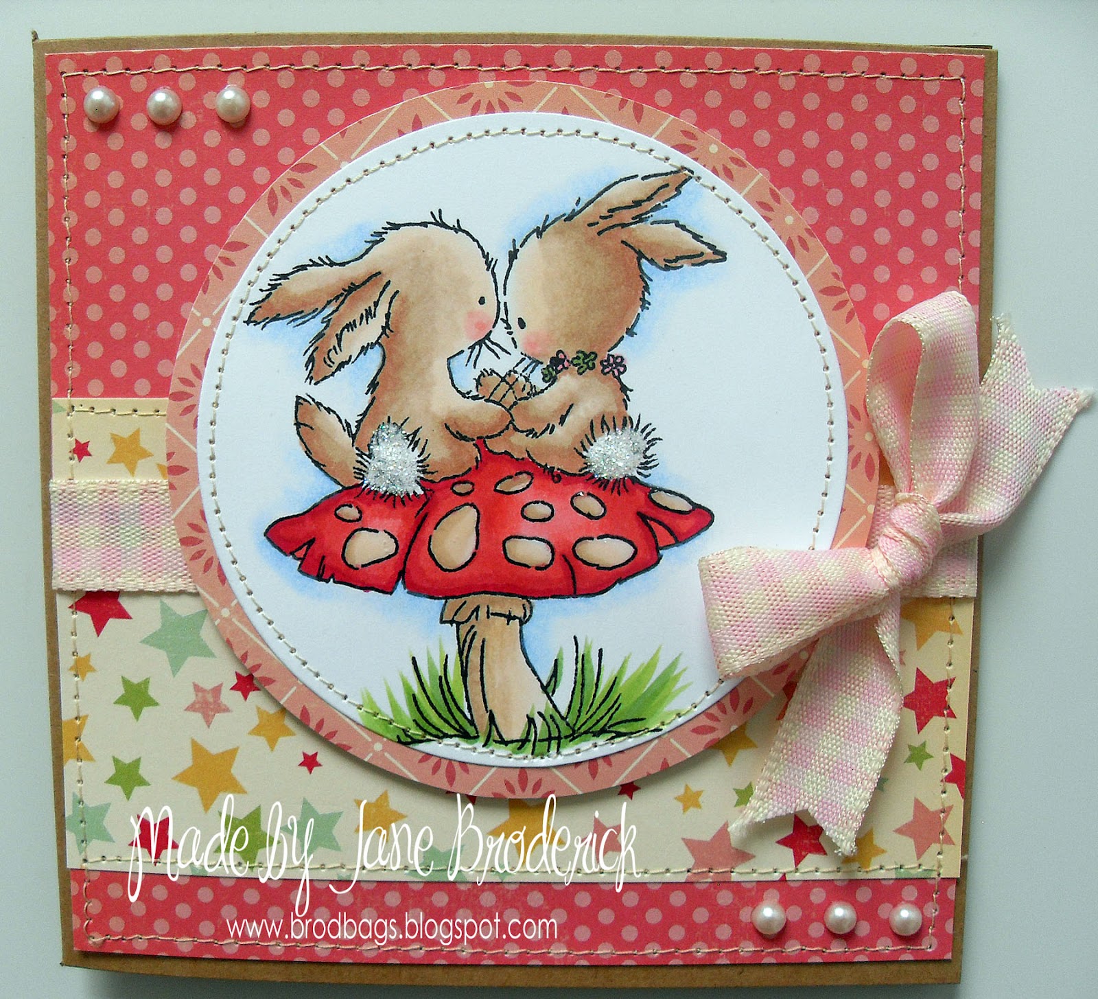(Jane used: saddlestitch and ruffle edge ribbons, polka dot button, carnation, cherry blossom and pretty blossom flowers, ahesive pearls)