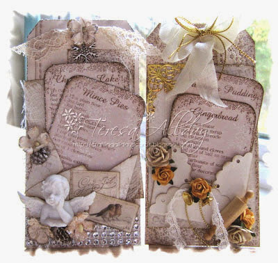 (Lillemor used: Rusty Jingle Bell 11 mm, 55 mm Monique Guipure Lace, Stickles stardust,, Liquid Pearl Bisque, Prima Resin Angels, Natural Botton Button Twine, 3 mm White Bead String and snowflake wooden button)